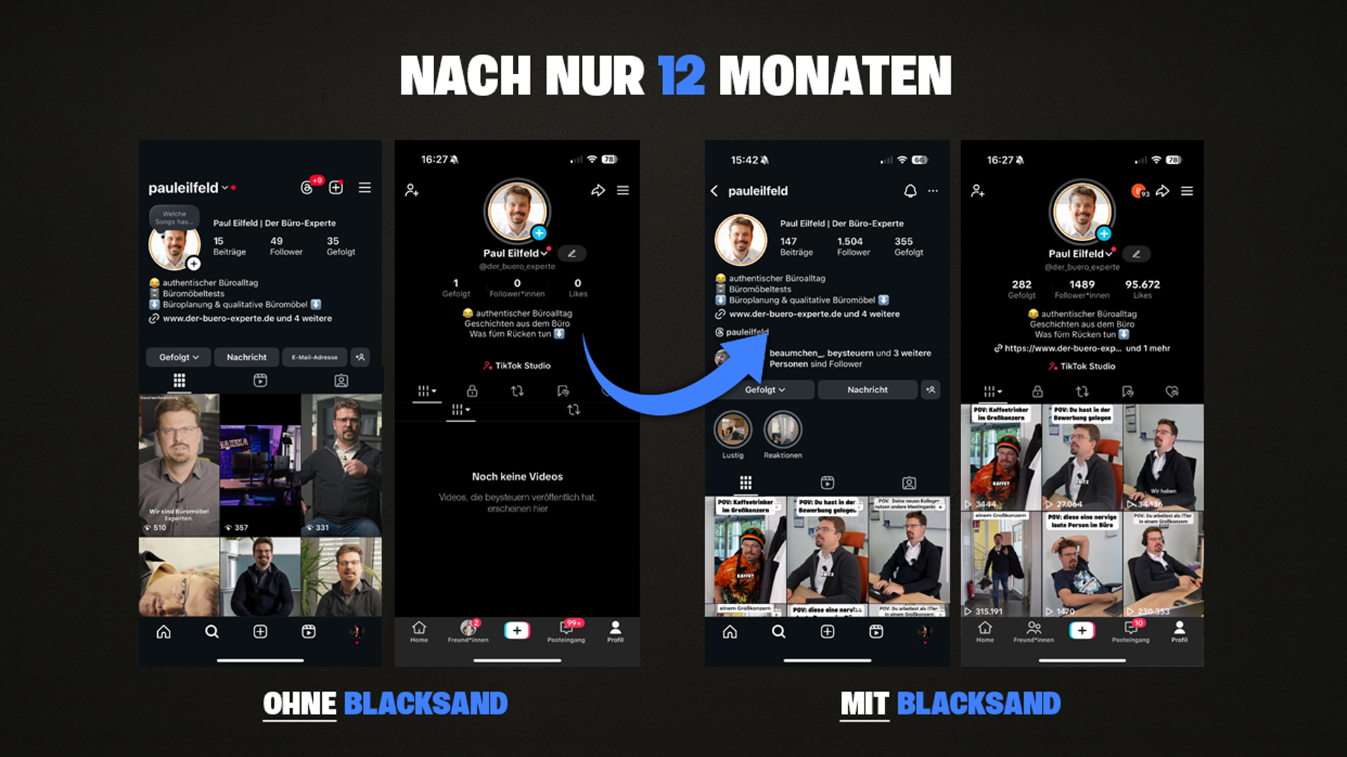 Die Sichtbarkeit von Büromöbelexperte ist mit durchschnittlich 1,3 Millionen erreichten Menschen jeden Monat für dieses eigentlich langweilige und trockene Thema enorm. Man muss aber offen zugeben, dass es schwer zu messen ist, wie viele verkaufte Tische, Bürostühle oder ganze Büroeinrichtungen tatsächlich darauf zurückzuführen sind. Was hingegen einfach zu messen ist, ist sein Bekanntheitsgrad. Eine enorme Zahl von Unternehmern spricht ihn auf Veranstaltungen an. Er ist zweifellos die bekannteste Person in seiner Nische in ganz Deutschland und hat sich auf LinkedIn mittlerweile eine richtige Fanbase aufgebaut, die jede Woche gespannt auf die neuen Videos wartet.